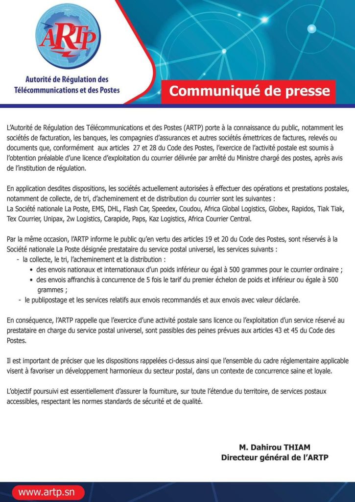 L’ARTP publie la liste des sociétés actuellement détentrices de Licence d’exploitation du courrier délivré et autorisées à effectuer des opérations et prestations postales ..