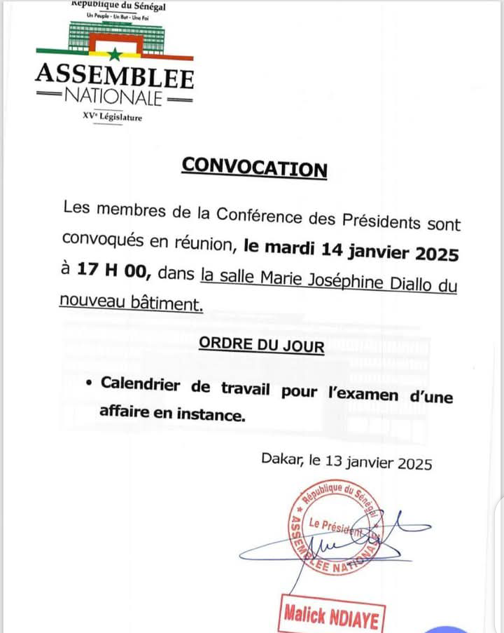 leader221 janvier 14, 2025 Assemblée nationale : Les membres de la conférence des présidents convoqués ce mardi à… ACTUALITES Partager FacebookTwitterWhatsAppLinkedinTelegram Tagsassemblée nationale Articles récents ACTUALITES GESTION DE L’AUTOROUTE ILA TOUBA ET DU PONT DE FOUDIOUGNE : Des sous traitants hors la loi se sucrent sur le contrat de 99,048... novembre 4, 2025 0 La Délégation de service public actée par voie de... ACTUALITES Décision sur le cas Ahmeth Ndoye : la bonne et la mauvaise nouvelle novembre 4, 2025 0 La Loi n° 2020-28 du 7 juillet 2020, modifiant... ACTUALITES Le Président Faye a présidé ce matin la cérémonie d’ouverture de la 8e édition du Salon International des Mines du Sénégal novembre 4, 2025 0 Le Président de la République, Son Excellence Bassirou Diomaye... SPORTS Circulaire : le CNG prend une nouvelle décision concernant les lutteurs blessés novembre 4, 2025 0 leader221https://leader221.com GESTION DE L’AUTOROUTE ILA TOUBA ET DU PONT DE FOUDIOUGNE : Des sous traitants hors la loi se sucrent sur le contrat de 99,048... Yayah Souare - novembre 4, 2025 La Délégation de service public actée par voie de régie intéressée pour la gestion de l’autoroute Ila Touba et du pont à péage de... Lire la suite Décision sur le cas Ahmeth Ndoye : la bonne et la mauvaise nouvelle Yayah Souare - novembre 4, 2025 La Loi n° 2020-28 du 7 juillet 2020, modifiant le Code pénal, a introduit depuis cinq ans le placement sous surveillance électronique comme mode... Lire la suite Le Président Faye a présidé ce matin la cérémonie d’ouverture de la 8e édition du Salon International des Mines du Sénégal Yayah Souare - novembre 4, 2025 Le Président de la République, Son Excellence Bassirou Diomaye Faye, a présidé ce matin la cérémonie d’ouverture de la 8e édition du Salon International... Lire la suite LAISSER UN COMMENTAIRE Annuler la réponse Commenter : S'il vous plaît entrez votre commentaire! Nom : S'il vous plaît entrez votre nom ici Email : Vous avez entré une adresse email incorrecte! Veuillez entrer votre adresse email ici Site : Enregistrer mon nom, email et site web dans ce navigateur pour la prochaine fois que je commenterai. Prévenez-moi de tous les nouveaux commentaires par e-mail. Prévenez-moi de tous les nouveaux articles par e-mail. Δ