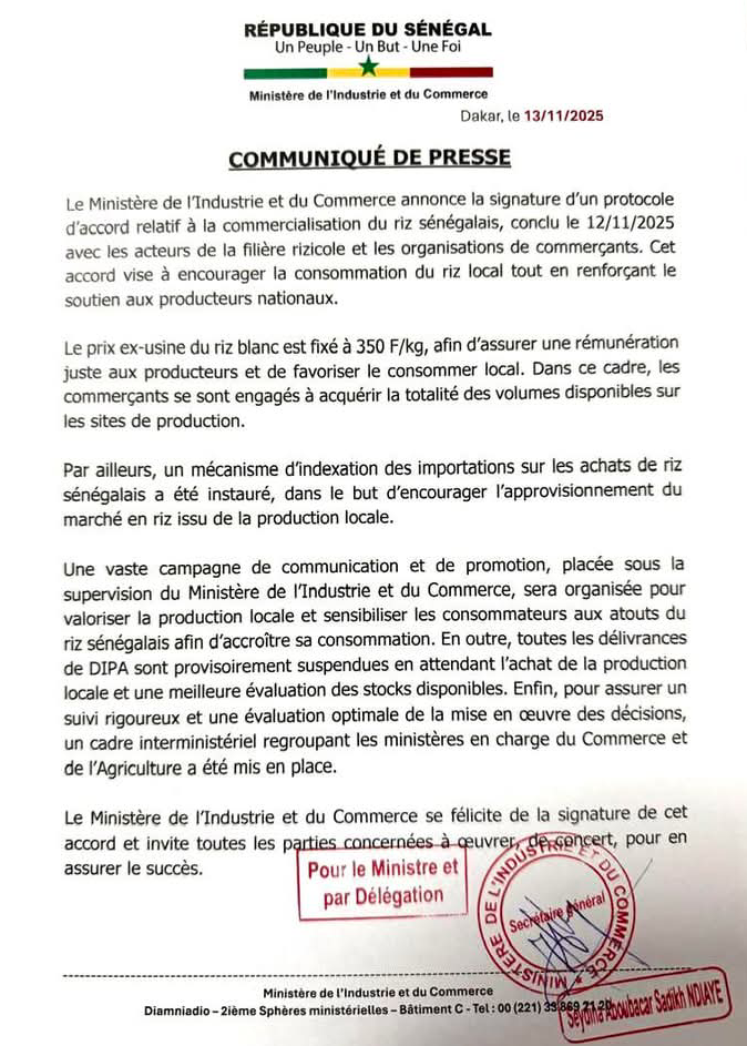 leader221 novembre 13, 2025 Bonne nouvelle ! Le gouvernement renforce la commercialisation du riz sénégalais et soutient les producteurs locaux ACTUALITES Partager FacebookTwitterWhatsAppLinkedinTelegram TagsCommerceCommuniquéIndustrie Articles récents ACTUALITES UCAD :Les affrontements entre forces de l’ordre et étudiants reprennent, plusieurs blessés enregistrés décembre 1, 2025 0 Les affrontements entre forces de l'ordre et étudiants se... Buzz La célèbre Styliste Kine Dione signe son come back avec “Secret of Beauty Fashion Show” décembre 1, 2025 0 La célèbre styliste et modéliste Kiné Dione, fondatrice de... SPORTS Nécrologie : Disparition de Diarra Condé, dite “Diakoly”, figure emblématique du 12e Gaïndé novembre 30, 2025 0 Le Sénégal perd aujourd’hui l’une de ses voix les... ACTUALITES Malika : interpellation de quatre individus pour association de malfaiteurs novembre 29, 2025 0 Le Commissariat d’Arrondissement de Malika a procédé, ce 27... leader221https://leader221.com UCAD :Les affrontements entre forces de l’ordre et étudiants reprennent, plusieurs blessés enregistrés leader221 - décembre 1, 2025 Les affrontements entre forces de l'ordre et étudiants se poursuivent, plusieurs blessés enregistrés De violents affrontements ont éclaté le 1er décembre 2025 à l’université Cheikh... Lire la suite La célèbre Styliste Kine Dione signe son come back avec “Secret of Beauty Fashion Show” leader221 - décembre 1, 2025 La célèbre styliste et modéliste Kiné Dione, fondatrice de la maison de couture Dione Atelier, signe son grand retour sur la scène de la... Lire la suite Nécrologie : Disparition de Diarra Condé, dite “Diakoly”, figure emblématique du 12e Gaïndé leader221 - novembre 30, 2025 Le Sénégal perd aujourd’hui l’une de ses voix les plus vibrantes du soutien populaire aux Lions. Diarra Condé, plus connue sous le nom de... Lire la suite LAISSER UN COMMENTAIRE Annuler la réponse Commenter : S'il vous plaît entrez votre commentaire! Nom : S'il vous plaît entrez votre nom ici Email : Vous avez entré une adresse email incorrecte! Veuillez entrer votre adresse email ici Site : Enregistrer mon nom, email et site web dans ce navigateur pour la prochaine fois que je commenterai. Prévenez-moi de tous les nouveaux commentaires par e-mail. Prévenez-moi de tous les nouveaux articles par e-mail. Δ
