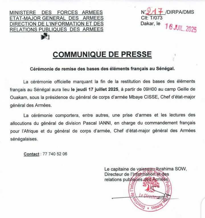 Communiqué : Cérémonie de remises des bases des éléments français au Sénégal