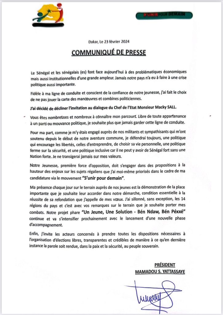 Communiqué : Mamadou Yattassaye décline l’invitation du chef de l’État M. Macky Sall