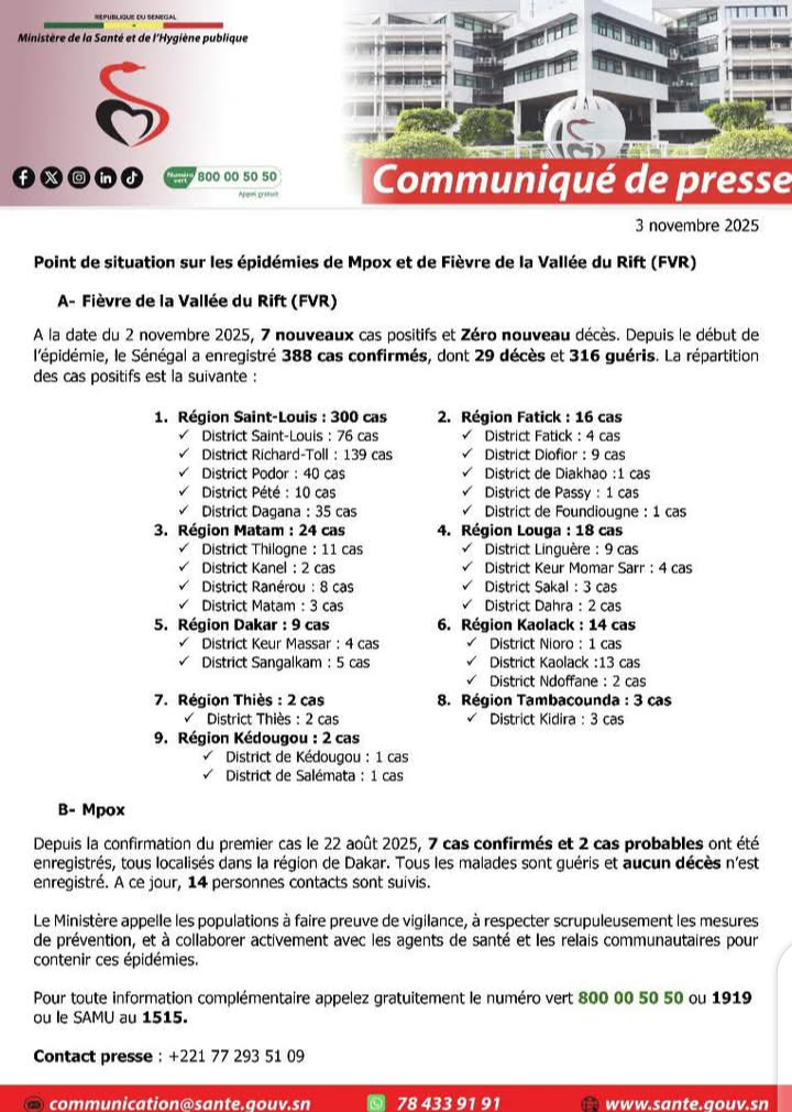 Yayah Souare novembre 3, 2025 Communiqué : Point de situation sur les épidémies de Mpox et de Fièvre de la Vallée du Rift à la date du 2 novembre 2025. SANTE Partager FacebookTwitterWhatsAppLinkedinTelegram TagsCommuniqué Articles récents ACTUALITES Urgent : Modou Yade condamné à 3 mois de prison ferme et à verser 10 millions de Fcfa à la partie civile novembre 3, 2025 0 Modou Yade, l’ex-mari de Lissa Tine vient d'être condamné... ACTUALITES 19e Assemblée générale de l’Agence universitaire de la Francophonie : Le Chef de l’État Faye a rappelé que la science et la culture sont... novembre 3, 2025 0 La 19e Assemblée générale de l’Agence universitaire de la... CONTRIBUTION C’est quoi un Monstre selon une certaine presse ? (par Marvel NDOYE) novembre 3, 2025 0 Le magistère de Macky Sall a fait émerger une... SOCIETE Urgent : interpellation et à la garde à vue de deux individus suite à un accident de la circulation routière novembre 3, 2025 0 La Section accident du Commissariat central de Dakar a... Yayah Souarehttp://www.leader221.com Urgent : Modou Yade condamné à 3 mois de prison ferme et à verser 10 millions de Fcfa à la partie civile leader221 - novembre 3, 2025 Modou Yade, l’ex-mari de Lissa Tine vient d'être condamné à 3 mois de prison ferme pour discours contraires aux bonnes mœurs. Il est également... Lire la suite 19e Assemblée générale de l’Agence universitaire de la Francophonie : Le Chef de l’État Faye a rappelé que la science et la culture sont... Yayah Souare - novembre 3, 2025 La 19e Assemblée générale de l’Agence universitaire de la Francophonie (AUF) s’est ouverte ce lundi à Dakar, sous la présidence de Son Excellence le... Lire la suite C’est quoi un Monstre selon une certaine presse ? (par Marvel NDOYE) leader221 - novembre 3, 2025 Le magistère de Macky Sall a fait émerger une « certaine presse » des plus pourries et des plus corrompues de la planète. Pour... Lire la suite LAISSER UN COMMENTAIRE Annuler la réponse Commenter : S'il vous plaît entrez votre commentaire! Nom : S'il vous plaît entrez votre nom ici Email : Vous avez entré une adresse email incorrecte! Veuillez entrer votre adresse email ici Site : Enregistrer mon nom, email et site web dans ce navigateur pour la prochaine fois que je commenterai. Prévenez-moi de tous les nouveaux commentaires par e-mail. Prévenez-moi de tous les nouveaux articles par e-mail. Δ