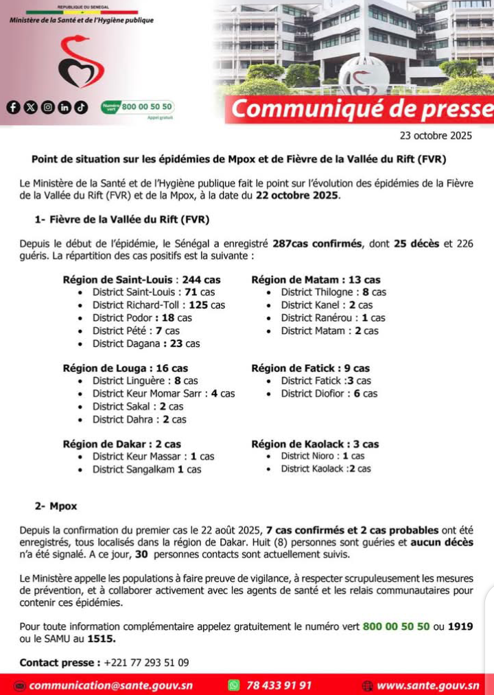‎Communiqué : Point de situation sur les épidémies de Mpox et de Fièvre de la Vallée du Rift à la date du 22 octobre 2025