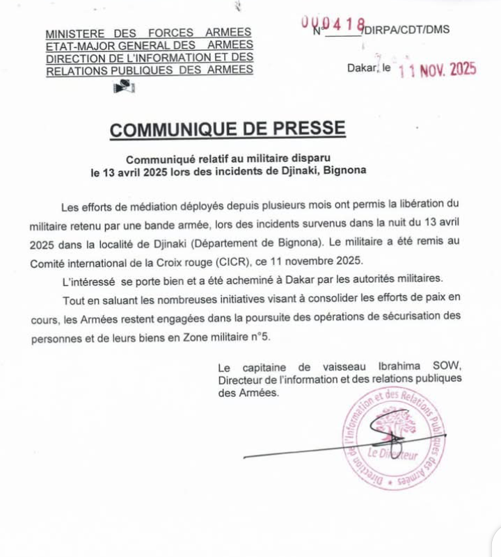 leader221 novembre 11, 2025 COMMUNIQUÉ RELATIF AU MILITAIRE DISPARU LE 13 AVRIL 2025 LORS DES INCIDENTS DE DJINAKI, BIGNONA ACTUALITES Partager FacebookTwitterWhatsAppLinkedinTelegram TagsCommuniquéDirpa Articles récents POLITIQUE Dernière minute : Communiqué du Bureau politique nationale de pastef les patriotes novembre 12, 2025 0 ACTUALITES Commission : le projet de budget 2026 du Ministère de l’Industrie et du Commerce, examiné et adopté ce mardi novembre 11, 2025 0 La Commission des Finances et du Contrôle budgétaire, élargie... ACTUALITES Palais de la République : Le Président Faye a reçu les lettres de créance de cinq nouveaux ambassadeurs accrédités novembre 11, 2025 0 Le Président de la République, Son Excellence Bassirou Diomaye... ACTUALITES Le fameux Compte de 1000 Milliards : La Cour des Comptes Confirme Ousmane Sonko novembre 11, 2025 0 leader221https://leader221.com Dernière minute : Communiqué du Bureau politique nationale de pastef les patriotes Yayah Souare - novembre 12, 2025 Lire la suite Commission : le projet de budget 2026 du Ministère de l’Industrie et du Commerce, examiné et adopté ce mardi Yayah Souare - novembre 11, 2025 La Commission des Finances et du Contrôle budgétaire, élargie à la Commission des Affaires économiques, a examiné et adopté, ce mardi 11 novembre 2025,... Lire la suite Palais de la République : Le Président Faye a reçu les lettres de créance de cinq nouveaux ambassadeurs accrédités leader221 - novembre 11, 2025 Le Président de la République, Son Excellence Bassirou Diomaye Faye, a reçu ce matin, au Palais de la République, les lettres de créance de... Lire la suite LAISSER UN COMMENTAIRE Annuler la réponse Commenter : S'il vous plaît entrez votre commentaire! Nom : S'il vous plaît entrez votre nom ici Email : Vous avez entré une adresse email incorrecte! Veuillez entrer votre adresse email ici Site : Enregistrer mon nom, email et site web dans ce navigateur pour la prochaine fois que je commenterai. Prévenez-moi de tous les nouveaux commentaires par e-mail. Prévenez-moi de tous les nouveaux articles par e-mail. Δ