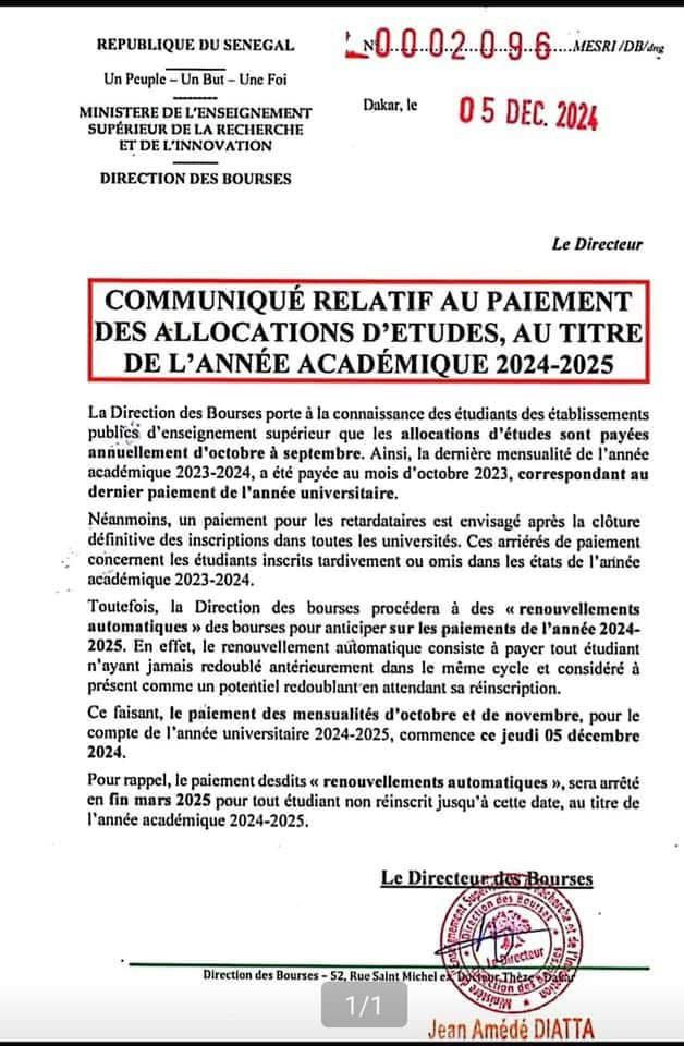 Communiqué Relatif : Paiement des allocations d’études au titre de l’année académique 2024 – 2025