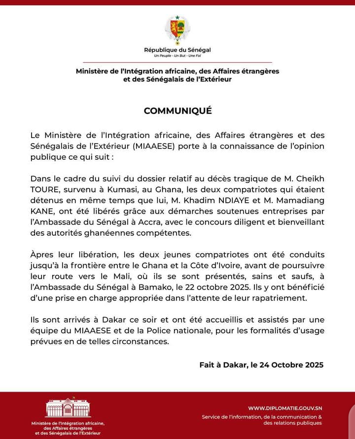 Àpres leur libération, les deux jeunes compatriotes ont été conduits jusqu’à la frontière entre le Ghana et la Côte d’Ivoire, avant de poursuivre leur route vers le Mali, où ils se sont présentés, sains et saufs, à l’Ambassade du Sénégal à Bamako, le 22 octobre 2025. Ils y ont bénéficié d’une prise en charge appropriée dans l’attente de leur rapatriement.