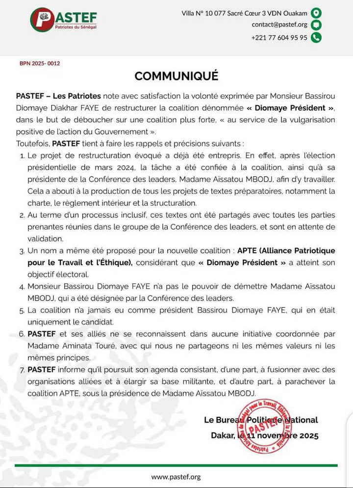 ‎PASTEF – Les Patriotes prennent note avec satisfaction de la volonté exprimée par Monsieur Bassirou Diomaye Diakhar FAYE de restructurer la coalition nommée « Diomaye Président >>>, dans le but de déboucher sur une coalition plus forte, << au service de la vulgarisation positive de l’action du Gouvernement > ».