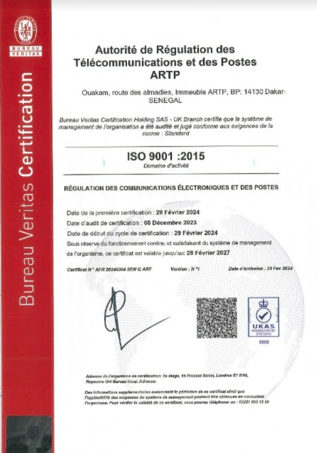 À la suite d’un audit réalisé le 8 décembre 2023, l’Autorité de régulation des télécommunications et des postes (ARTP) atteint une étape clé. Le bureau Veritas Certification Holding SAS – UK Branch a délivré à l’ARTP la certification ISO 9001: 2015 pour son système de management. Selon un collaborateur de la structure dirigée par Abdou Karim Sall, la notification leur est parvenue ce mardi 16 avril.