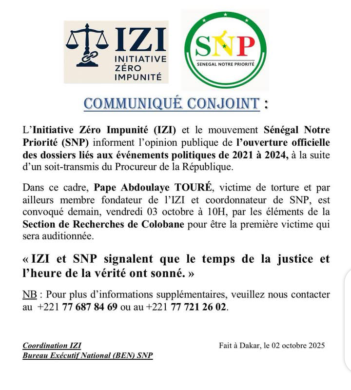 Le 20 octobre 2025, j’ai saisi le Procureur de la République près le Tribunal de Grande Instance Hors Classe de Dakar d’une plainte et...