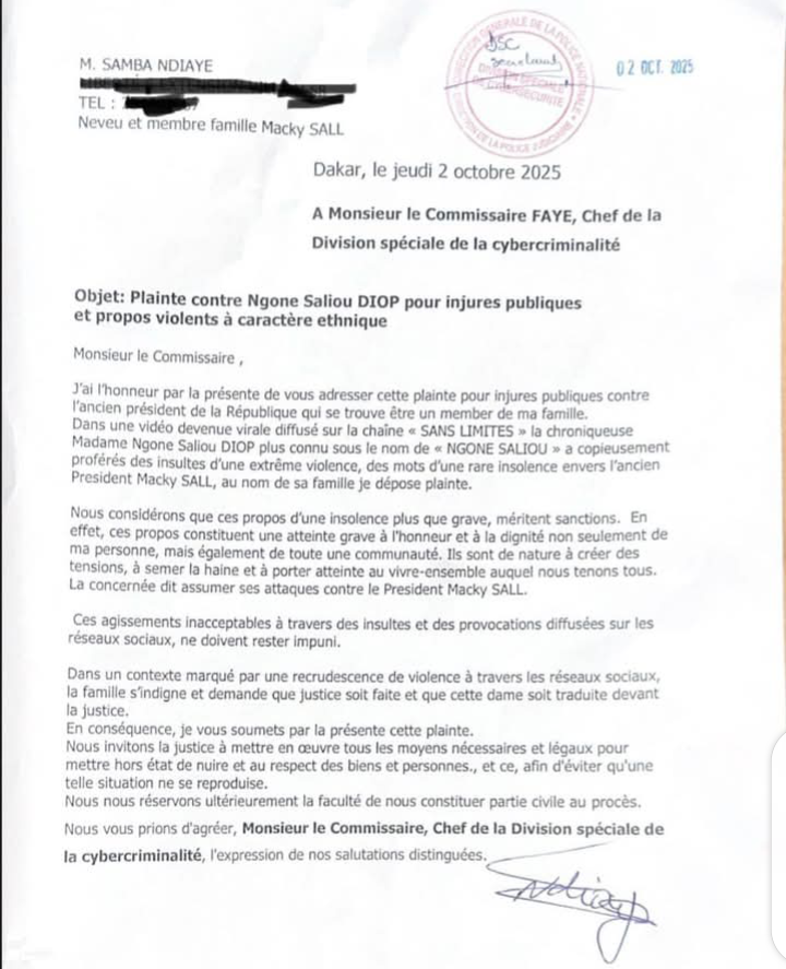 Ce matin, Samba Ndiaye, neveu direct de Macky sall a déposé une plainte pour le compte de la famille proche de Macky contre Ngoné Saliou Diop pour injures publiques et propos violents à caractère ethnique. Samba est le fils ainé de la grande sœur de Macky sall. Il devrait être entendu demain matin par le commissaire FAYE, chef de la division de la cybercriminalité.