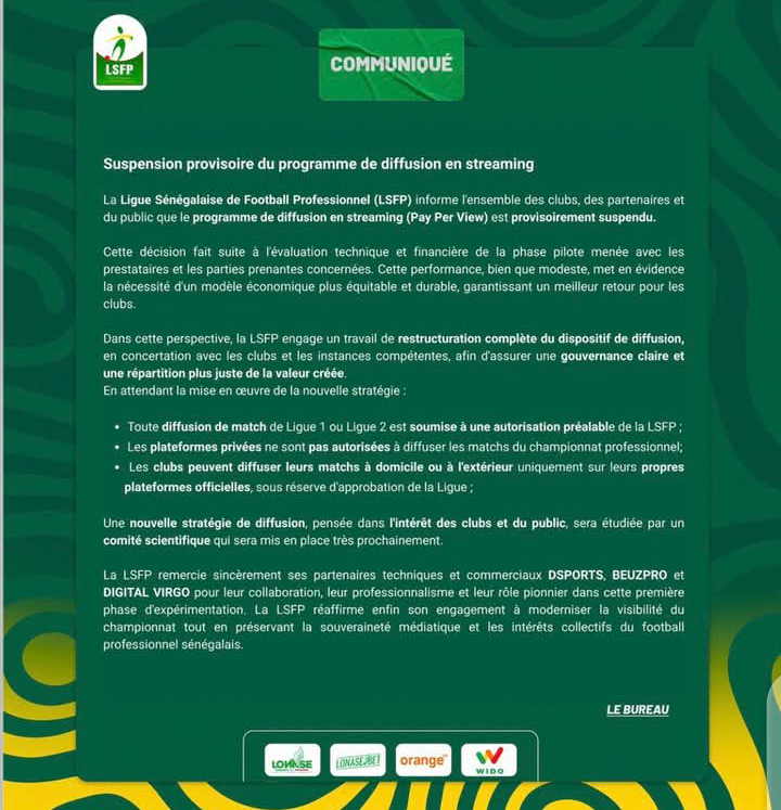 La Ligue Sénégalaise de Football Professionnel (LSFP) informe l’ensemble des clubs, des partenaires et du public que le programme de diffusion en streaming (Pay Per View) est provisoirement suspendu.