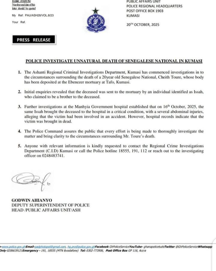 Le département des investigations criminelles d’Ashanti donne les premiers éléments de l’enquête sur la mort du jeune footballeur sénégalais, Cheikh Touré. Un individu nommé Issah, qui s’est présenté comme son frère l’a amené à l’hôpital public de Manhyia le 16 octobre.