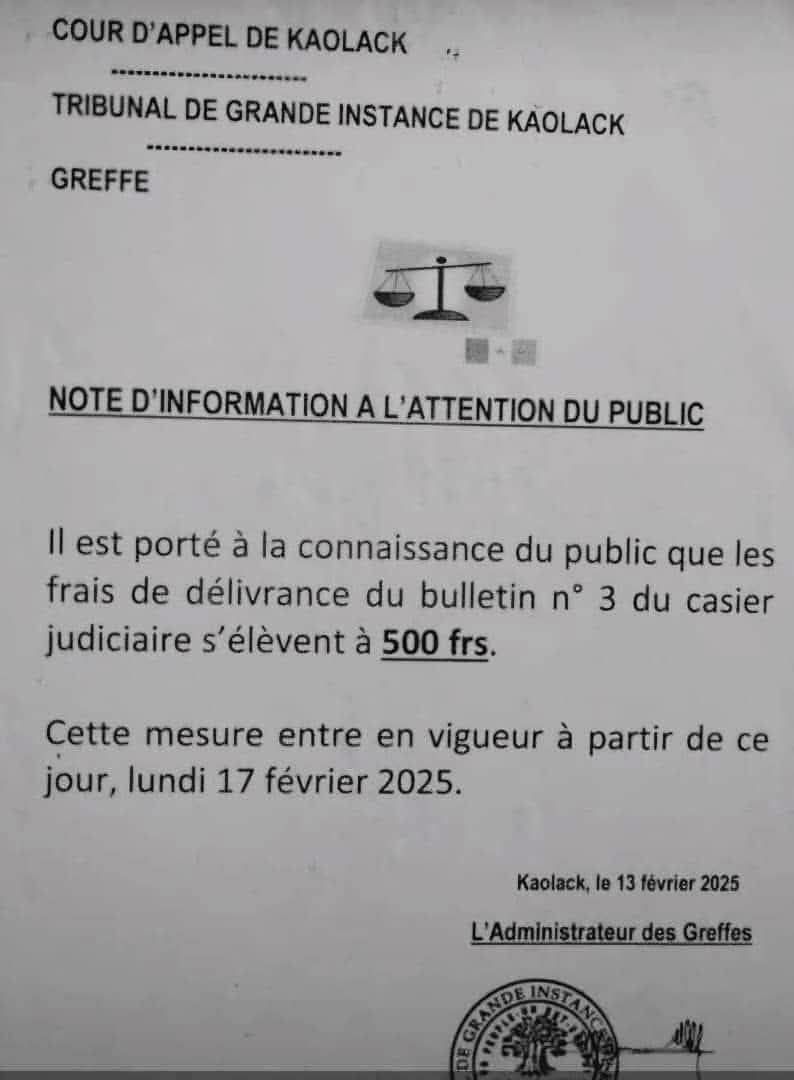 Note d’information : Les frais de délivrance du Casier judiciaire, s’élèvent à 500 FCFA