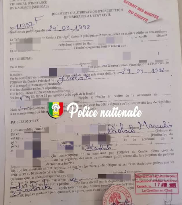 Interpellé sur la provenance de ces documents, le second mis en cause a déclaré que la plupart des actes d’État civil lui ont été déposés par des particuliers sollicitant ses services. Concernant les documents administratifs vierges, il a soutenu fallacieusement les avoir achetés aux abords du Centre d’État civil Principal de Kaolack.