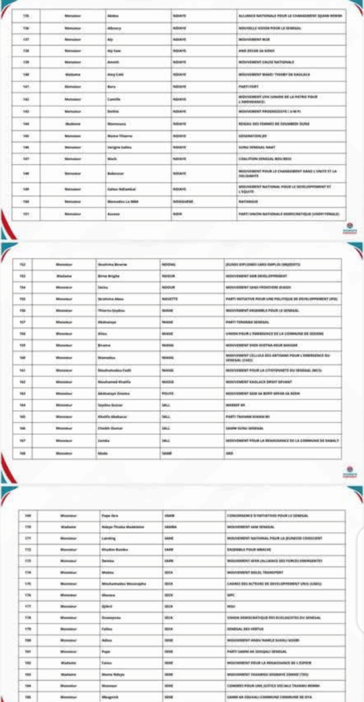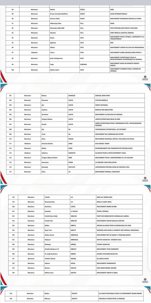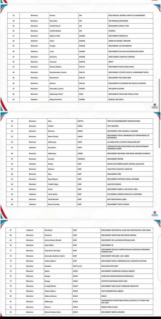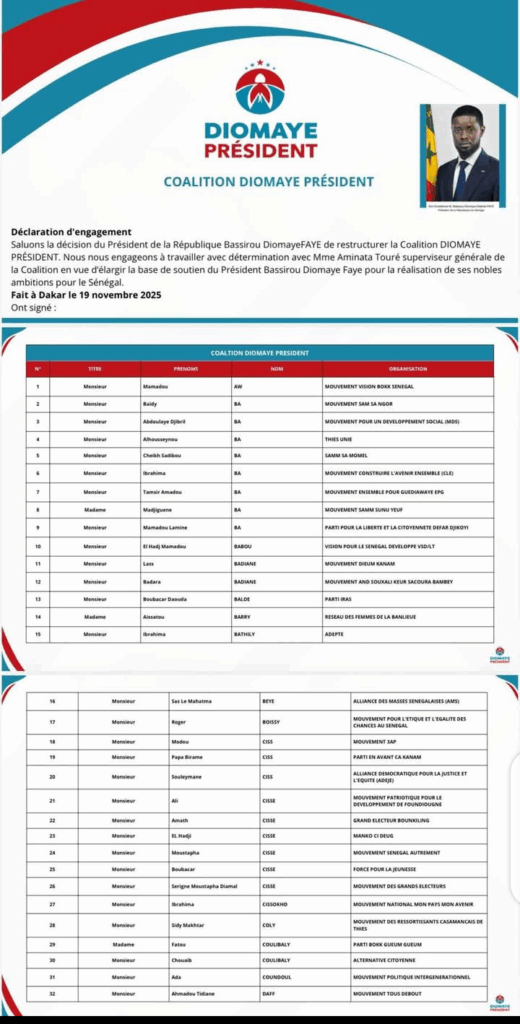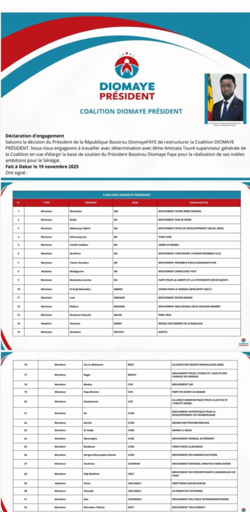 Cette liste rassemble à la fois les structures ayant renouvelé leur engagement et de nouvelles entités ayant rejoint la dynamique, apportant ainsi leur soutien actif au Président de la coalition, Bassirou Diomaye Diakhar Faye.