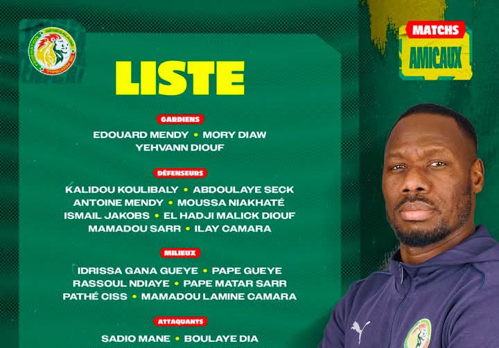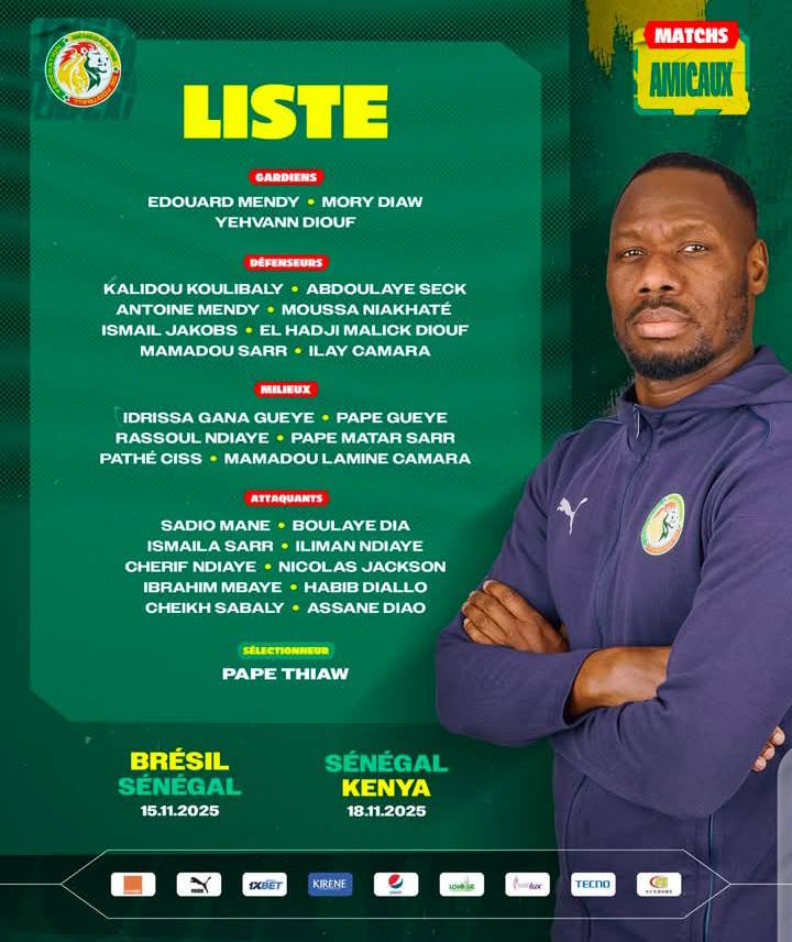 Liste des 27 lions du Sénégal retenus par le selectionneur national Pape Thiaw pour les matchs amicaux du mois de novembre 2025 : le 15/11 à Londres contre le Bresil et le 18/11 à Antalya contre le Kenya.