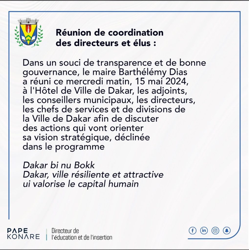 “Dans un souci de transparence et de bonne gouvernance, le maire Barthélémy Dias a réuni ce mercredi matin, 15 mai 2024, à l’hôtel de ville de Dakar, les adjoints, les conseillers municipaux, les directeurs, les chefs de service et de divisions de la ville de Dakar afin de discuter des actions qui vont orienter sa vision stratégique, déclinée dans le programme”, informe la note reçue à Leader221.
